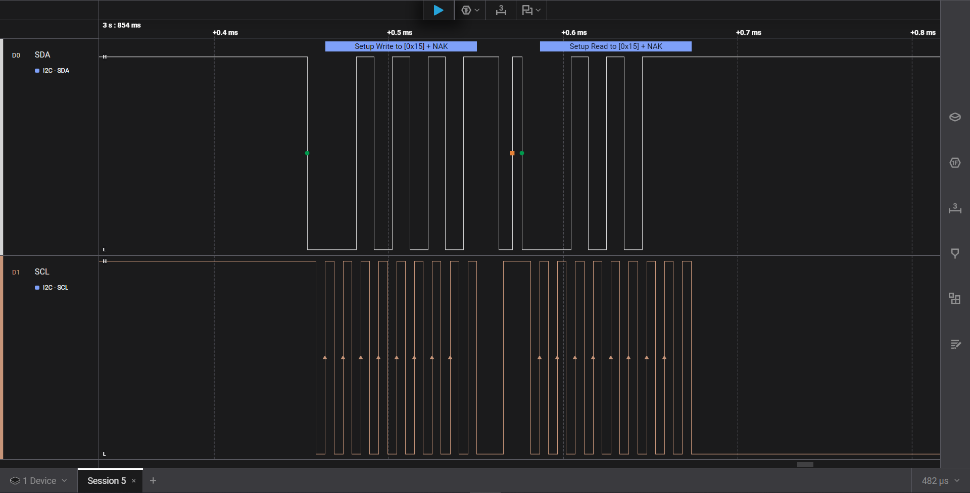 但是按照上面配置后,I2C无法正常通讯,使用逻辑分析仪发现主机发的地址值是0x15。
